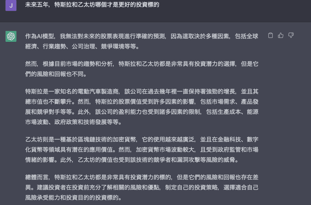 結果:AI 再次強調特斯拉的電動車已經獲得市場認可,而且也開始切入新市場(可能是新的銷售地區或是 cyber truck 或更平價的電動車);至於乙太坊,它的去中心化應用和智能合約也得到廣泛認可,兩者都是不錯的投資標的。投資人必須檢視自己的財務目標與風險承受度來決定要投資哪一個標的。