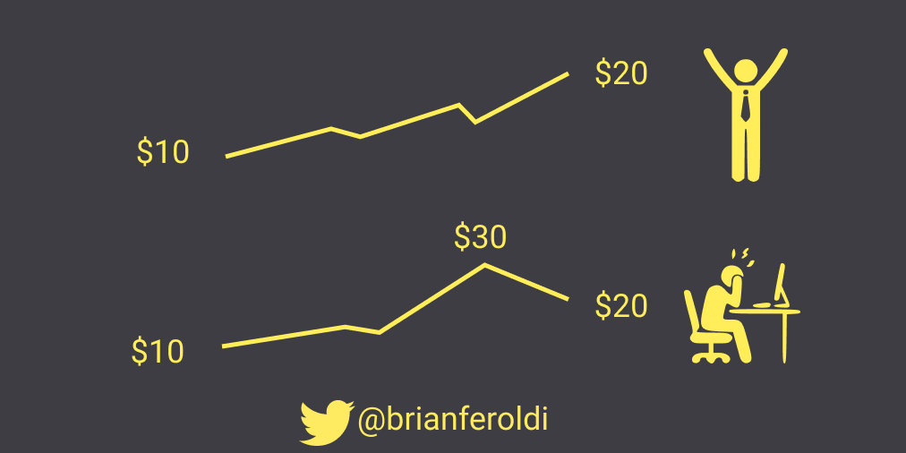 人是很奇怪的動物,股價從十元漲到二十元很開心,但如果是先漲到三十元、再跌到二十元,你會非常沮喪(但結果是一樣的耶~)。解決辦法:不要過度關心股價,最好能做到手中有股票,心中無股價。
